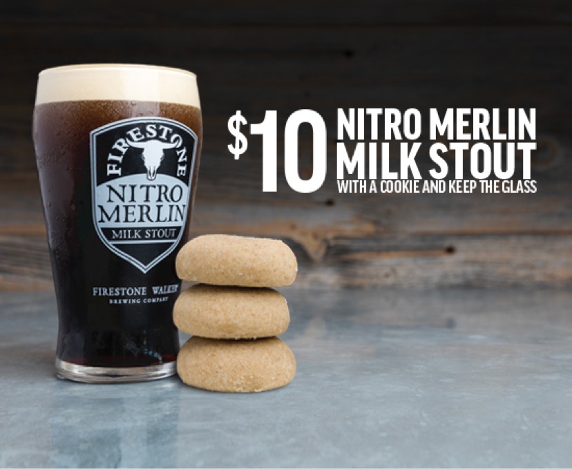 Enjoy a pint of Nitro Merlin Milk Stout paired with Brown Butter Cookie Co. cookies and keep the glass! Available at all Taproom locations.